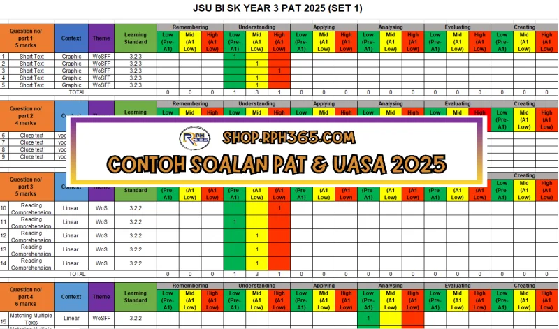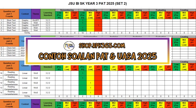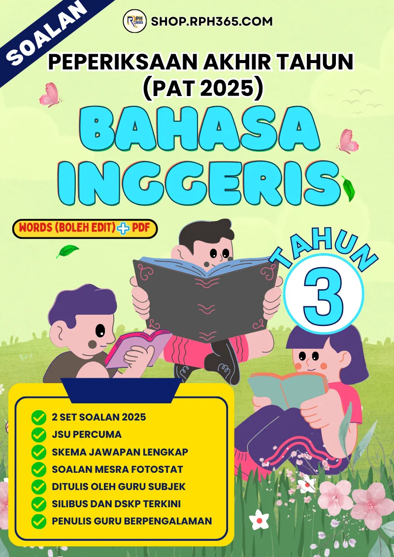 PAT 2025 Bahasa Inggeris Tahun 3 KSSR - 2 set lengkap dengan skema jawapan dan JSU untuk ujian akhir sesi. Format PDF siap guna.