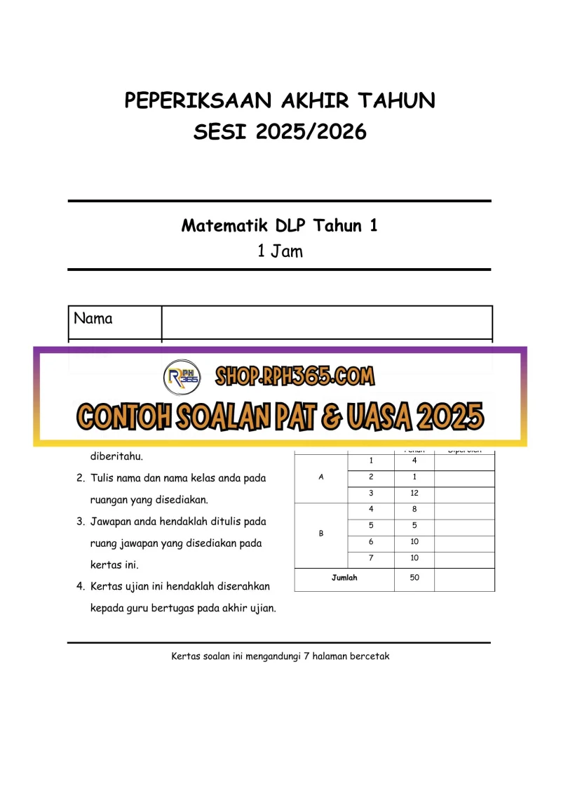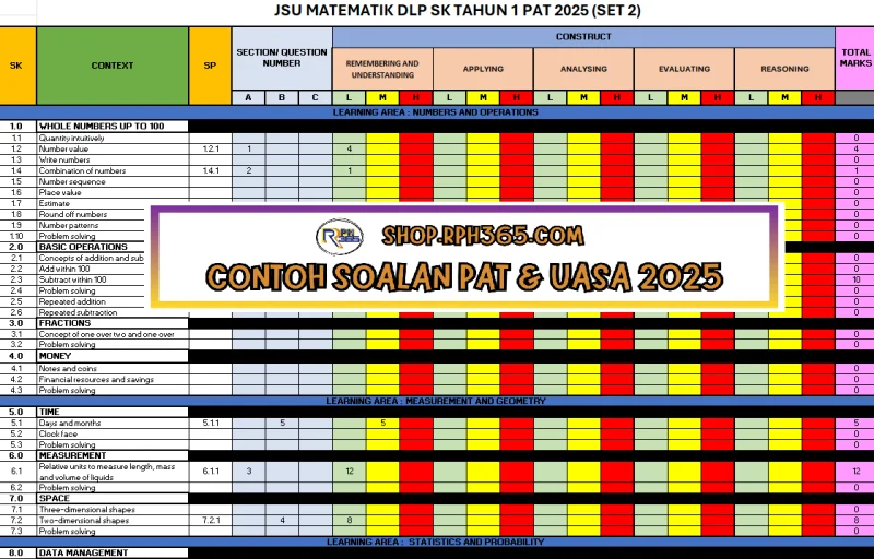 PAT 2025 Matematik DLP SK Tahun 1 by Cikgu Fatimah