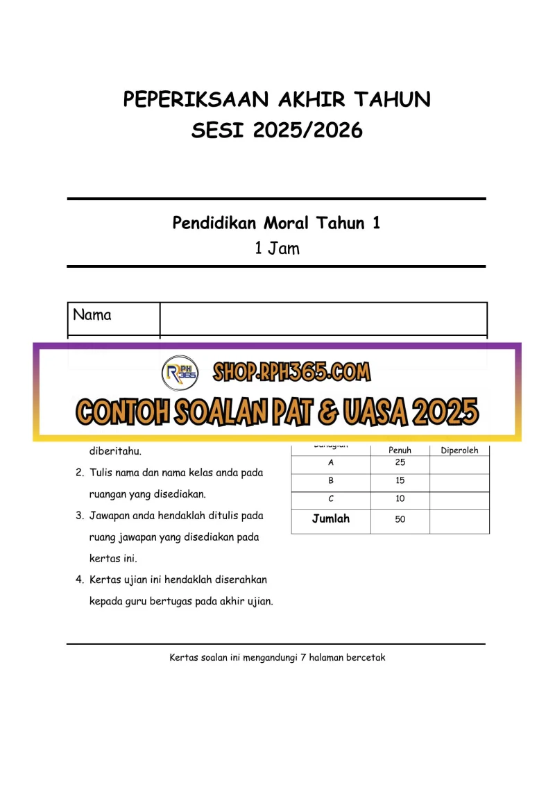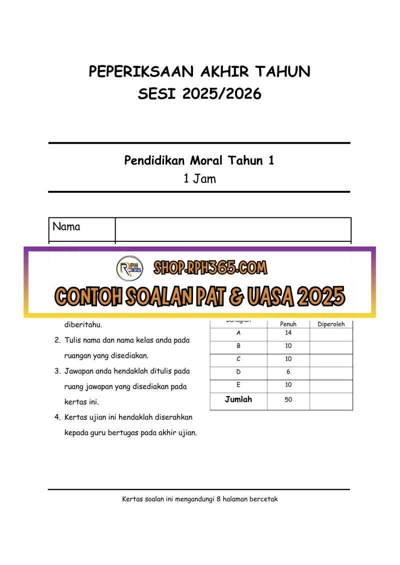 PAT 2025 Pend Moral SK Tahun 1 by Cikgu Fatimah