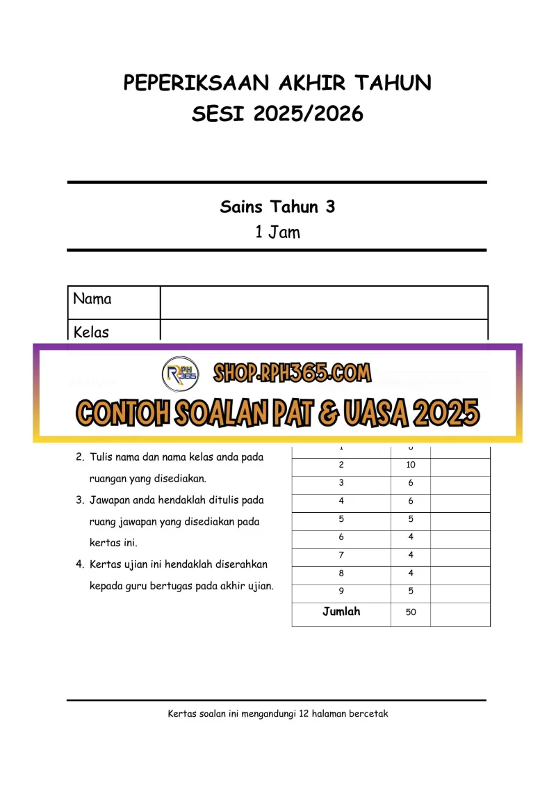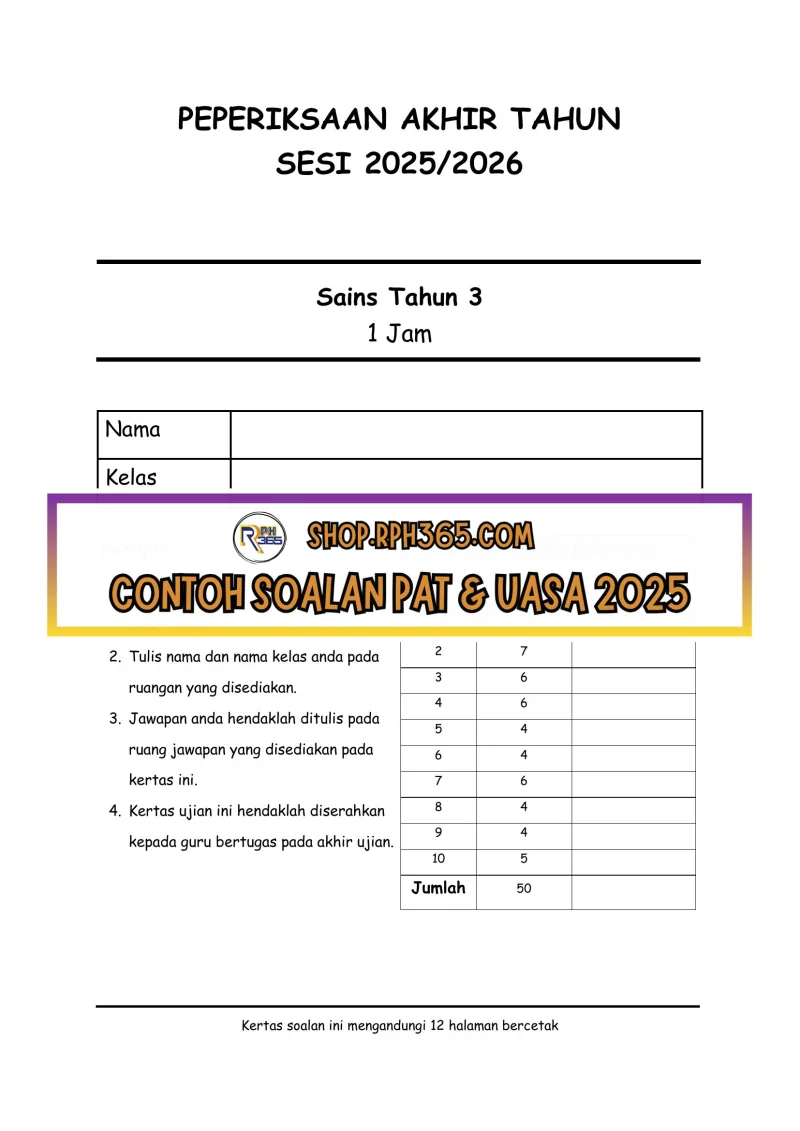 PAT 2025 Sains SK Tahun 3 by Ms Lilybee