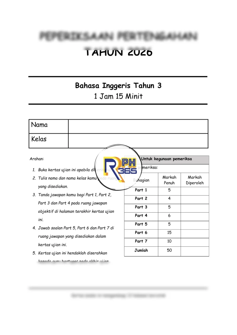 Koleksi 2 set soalan Peperiksaan Pertengahan Tahun (PPT) Bahasa Inggeris Tahun 3 2026 ini disediakan khusus sebagai bahan pentaksiran pertengahan tahun untuk murid sekolah rendah. Setiap set lengkap dengan kertas soalan, skema jawapan, dan JSU dalam format DOCX yang boleh diedit.