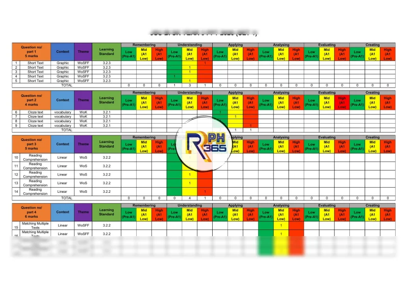 Nisbah aras kesukaran ditetapkan pada 5:3:2 iaitu Rendah 50%, Sederhana 30%, dan Tinggi 20%.