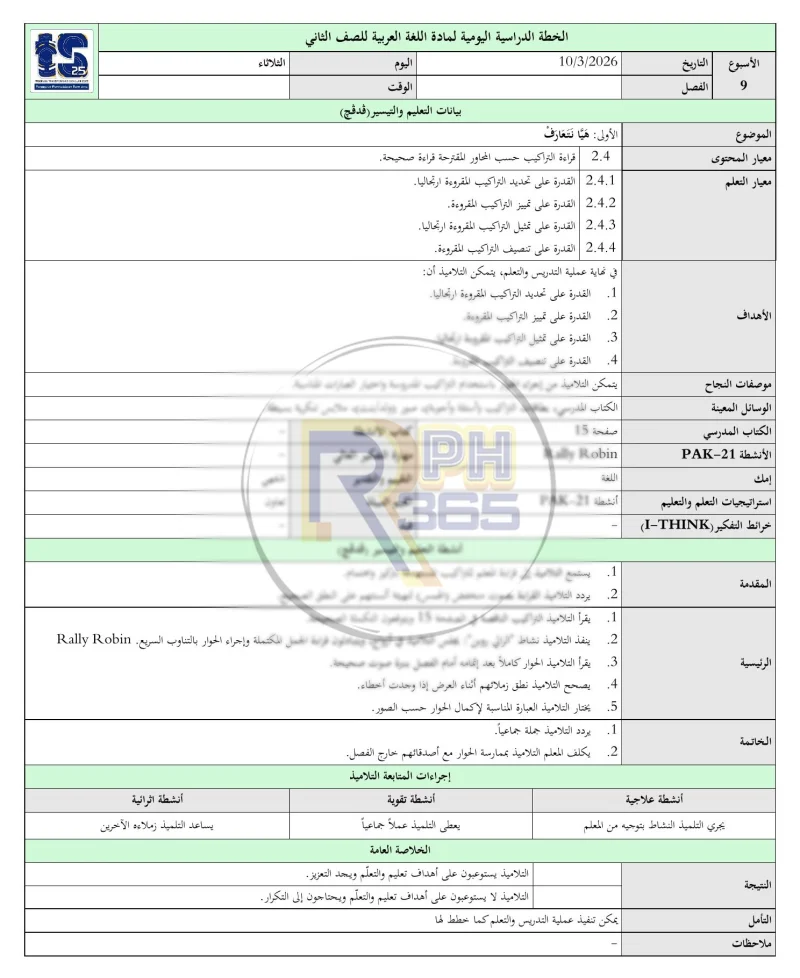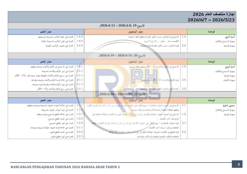 RPH & RPT 2026 Bahasa Arab Tahun 2 SK merupakan set lengkap dokumen pengajaran yang disusun mengikut Takwim Persekolahan 2026 selama 43 minggu. Ditulis oleh guru subjek sebenar berdasarkan DSKP KSSR Semakan 2017 dan buku teks rasmi.