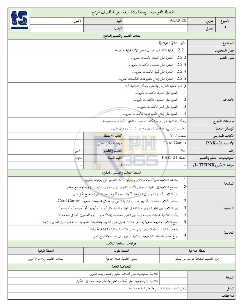 RPH & RPT 2026 Bahasa Arab Tahun 4 KSSR - unit Ash-Shuhur Al-Miladiyyah (Bulan Masehi) dengan 4 kemahiran lengkap (Istima', Kalam, Qiraah, Kitabah). Format DOCX & PDF boleh edit.