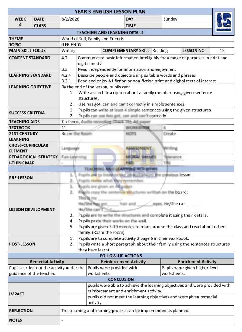 RPH & RPT 2026 Bahasa Inggeris Tahun 3 KSSR - tema lengkap World of Self, Family & Friends dengan 4 kemahiran bahasa dan Pendidikan Sivik. Format DOCX boleh edit.