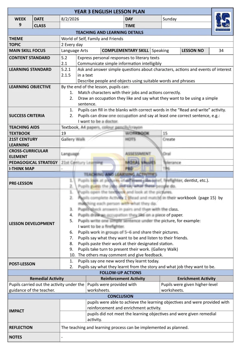 Sesuai untuk guru Bahasa Inggeris Sekolah Rendah yang mahukan perancangan pengajaran tersusun dan boleh disesuaikan mengikut keperluan kelas. Fail DOCX membolehkan penyuntingan penuh untuk disesuaikan dengan situasi sekolah masing-masing.