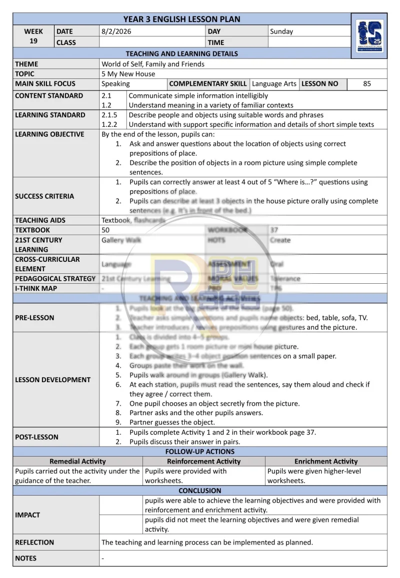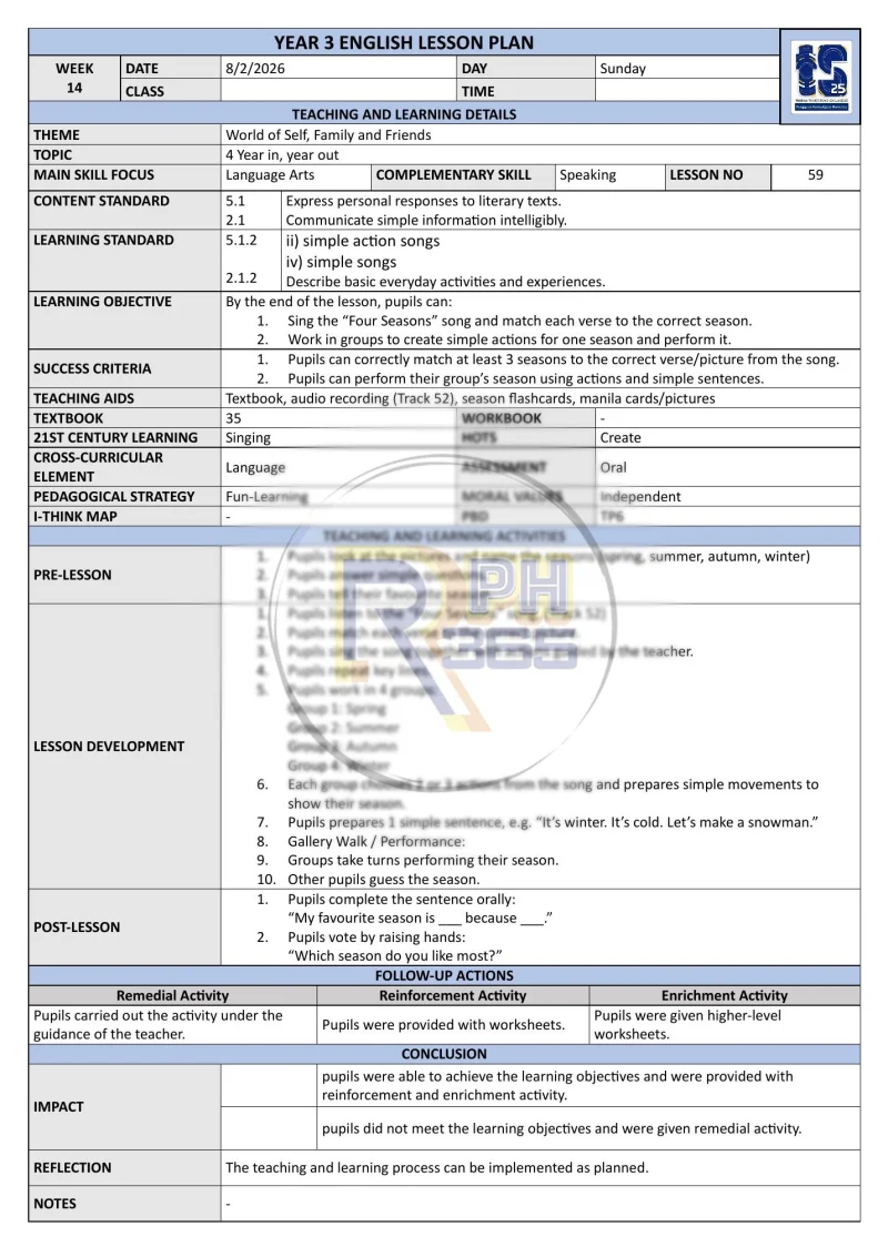 RPH & RPT 2026 Bahasa Inggeris Tahun 3 SK lengkap disusun mengikut 43 minggu Takwim Persekolahan 2026. Ditulis oleh guru subjek berpengalaman dengan kandungan terperinci mengikut DSKP KSSR Semakan 2017.