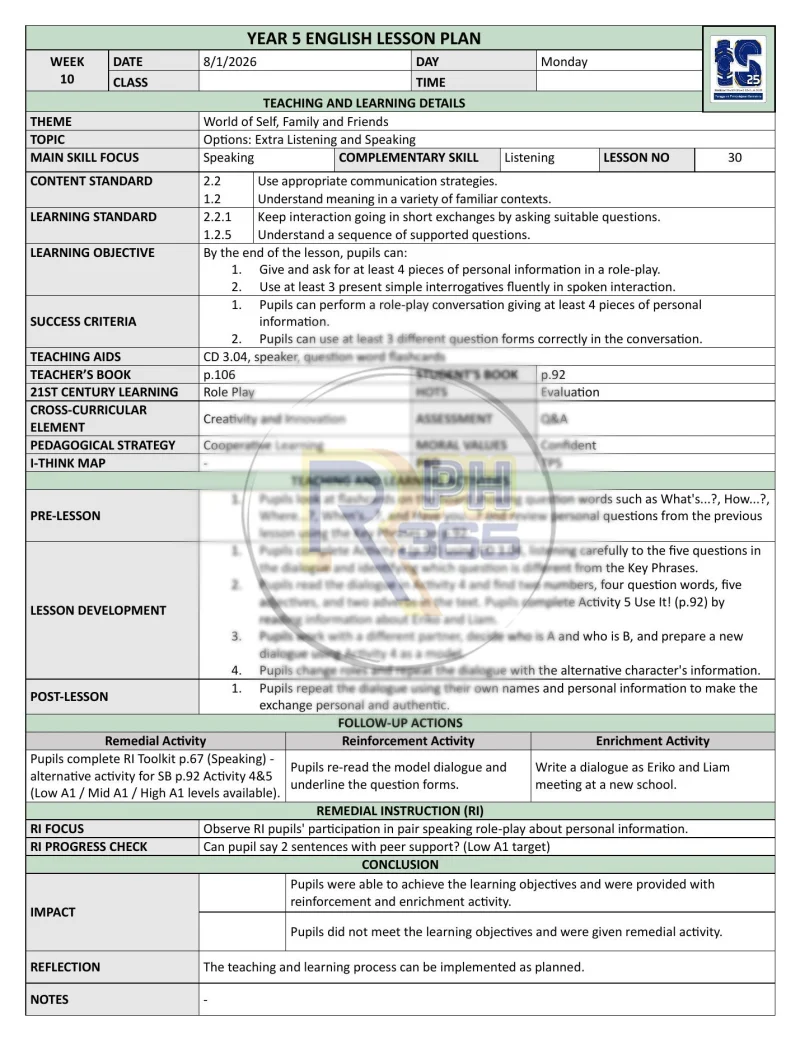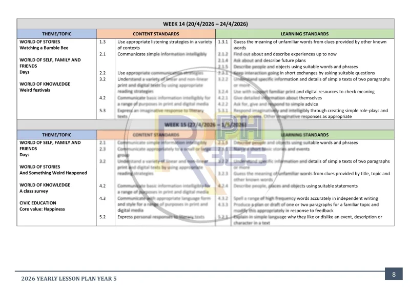 RPH & RPT 2026 Bahasa Inggeris Tahun 5 by RPH365 ialah set perancangan pengajaran lengkap untuk guru Bahasa Inggeris Tahap 2 yang ingin menyediakan PdP secara lebih sistematik, kemas dan menjimatkan masa. Bahan ini disusun mengikut Takwim Persekolahan 2026 selama 43 minggu serta berpandukan KSSR Semakan 2017, DSKP dan buku teks semasa.