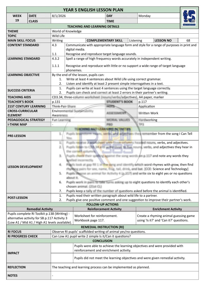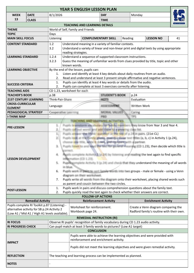 RPH & RPT 2026 Bahasa Inggeris Tahun 5 KSSR - 43 minggu lengkap dengan objektif pembelajaran, PBD, TS25, EMK dan aktiviti pengayaan. Format ZIP (DOCX, PDF) boleh edit.
