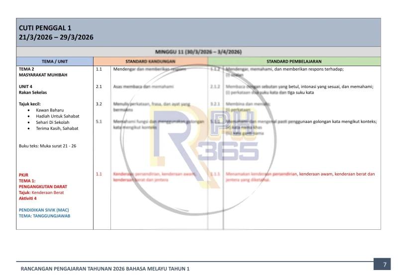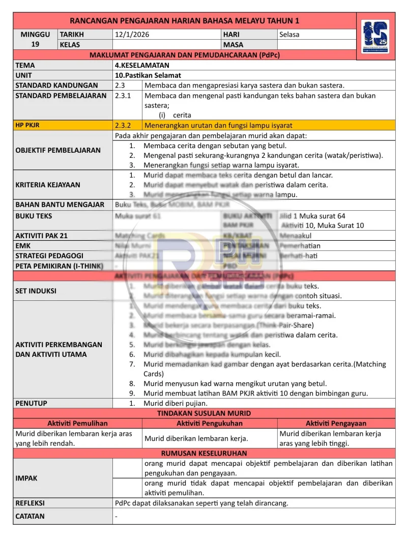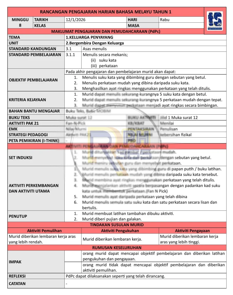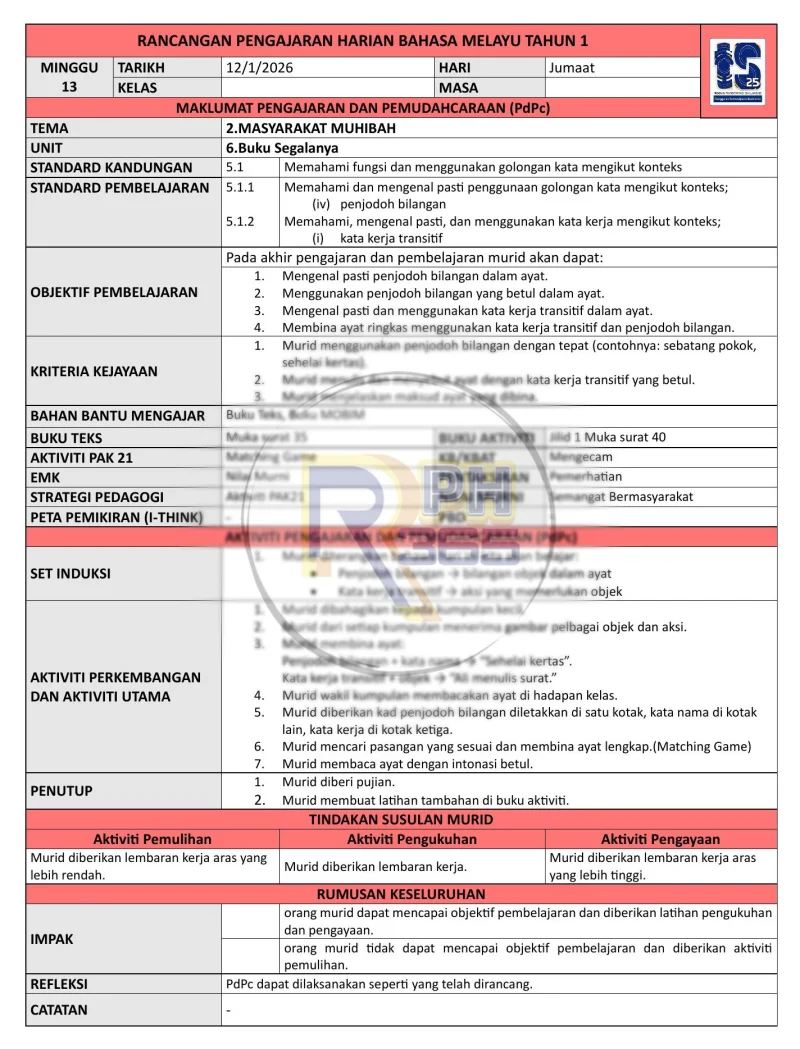 Set lengkap RPH & RPT 2026 Bahasa Melayu Tahun 1 SK yang disusun mengikut 43 minggu Takwim Persekolahan 2026. Ditulis khas oleh guru subjek berpengalaman mengikut DSKP KSSR Semakan 2017.