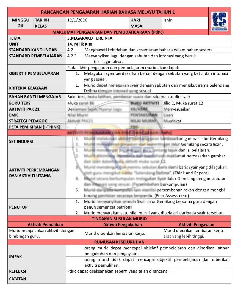 - RPH TS25 dengan integrasi PAK21, strategi pengajaran moden dan EMK