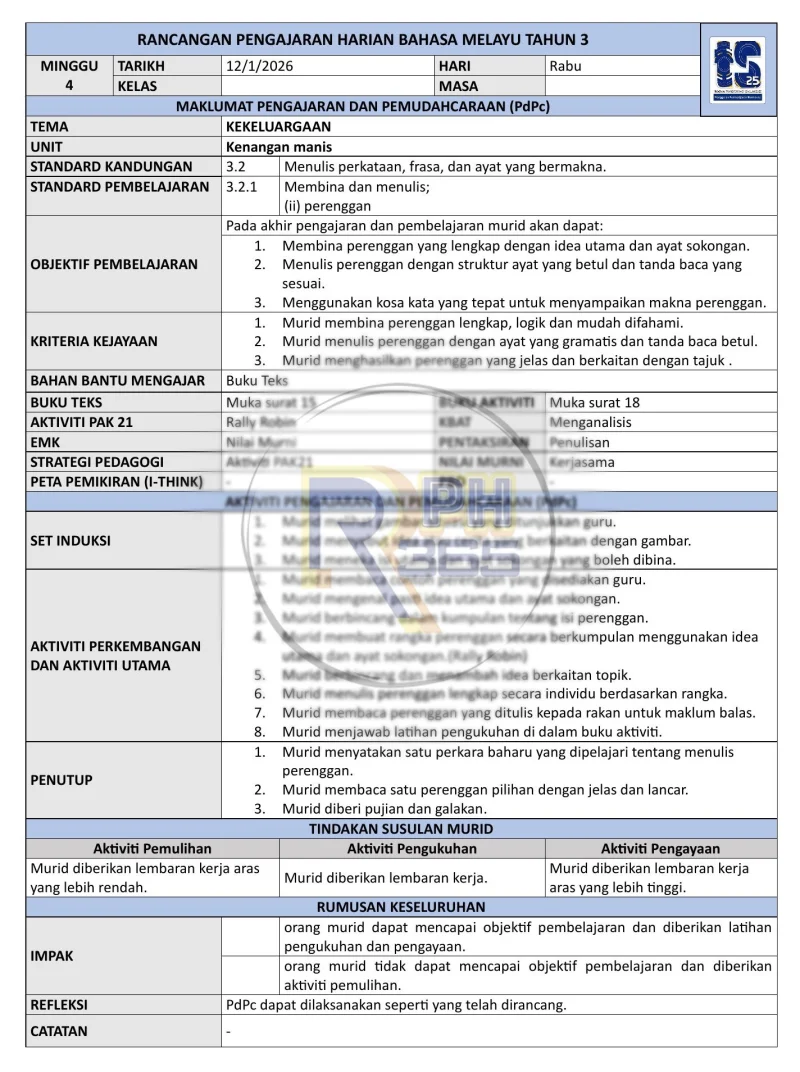 Sesuai untuk guru Bahasa Melayu Tahun 3 yang mahukan RPH tersusun dan berkualiti. Format Microsoft Word membolehkan penyuntingan penuh mengikut keperluan sekolah masing-masing.