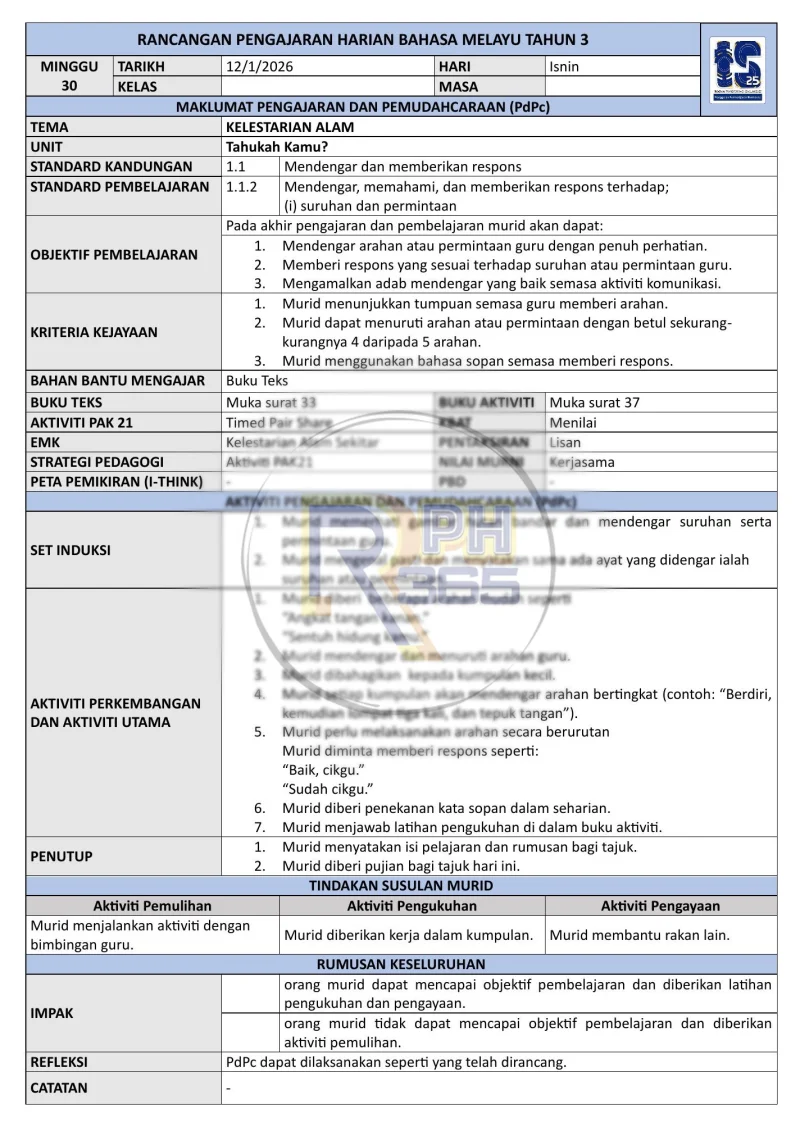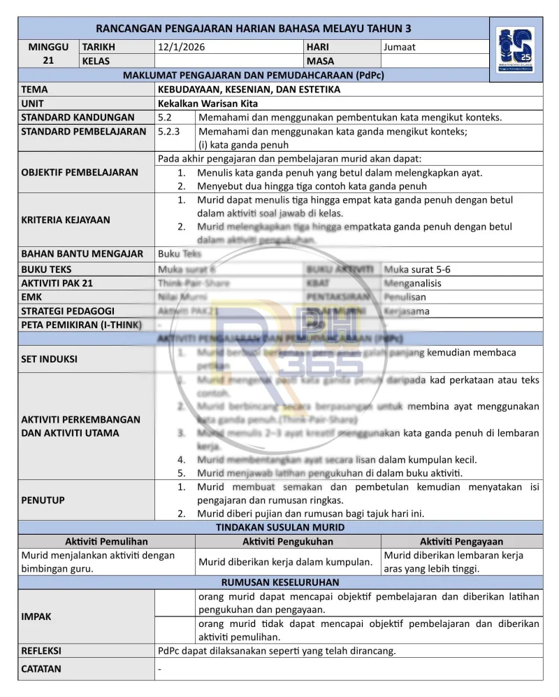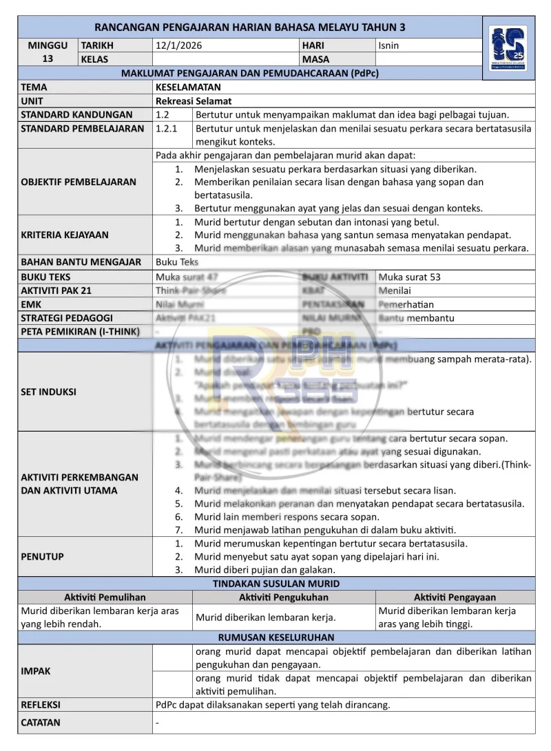 "Menepati penulisan RPH PAK 21. Lengkap mudah utk dilaksanakan. Sgt berpuas hati. "