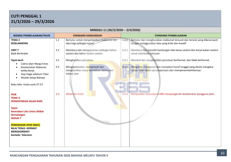Set lengkap RPH & RPT Bahasa Melayu Tahun 5 KSSR yang disusun mengikut Takwim Persekolahan 2026 (43 minggu). Ditulis oleh guru subjek berpengalaman dan berpandukan Buku Teks serta DSKP KSSR Semakan 2017.