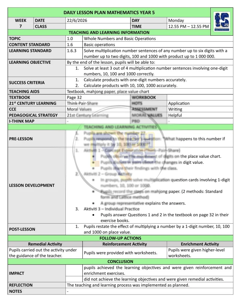 RPH & RPT 2026 Matematik DLP Tahun 5 by RPH365