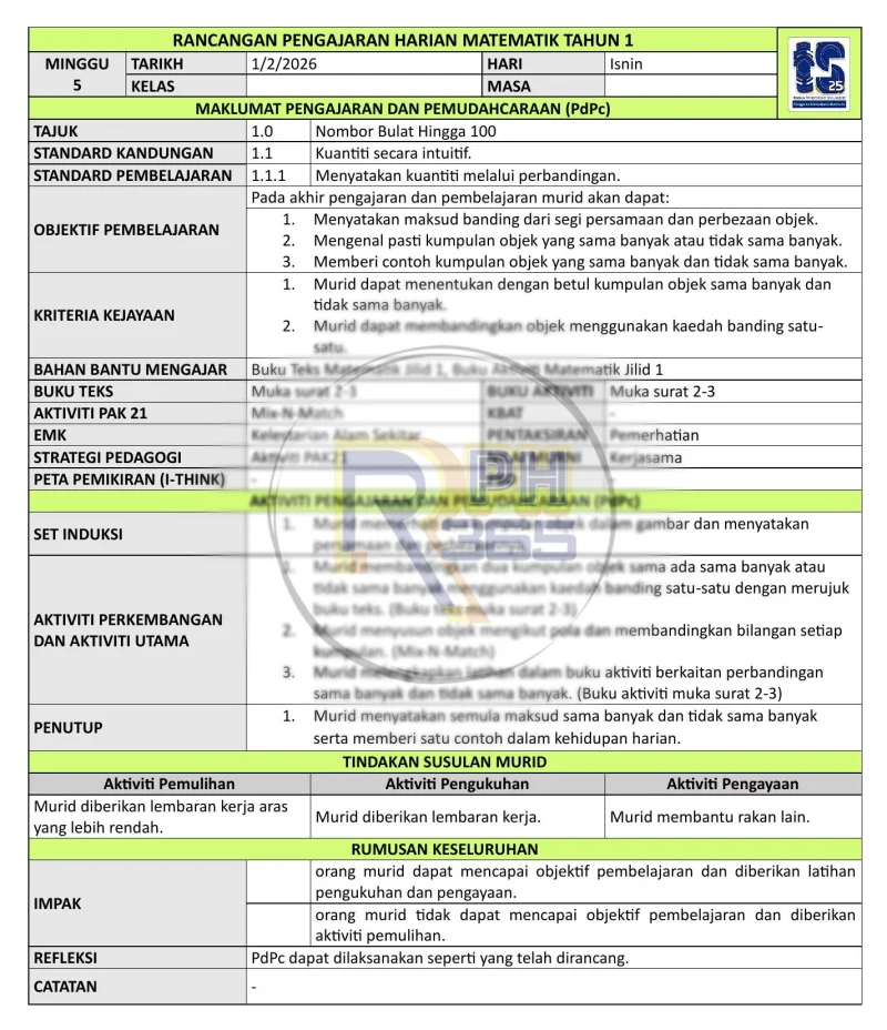 RPH & RPT 2026 Matematik Tahun 1 SK disediakan khas mengikut Takwim Persekolahan 2026 dengan lengkap 43 minggu pengajaran. Ditulis oleh guru subjek berpengalaman dan berpandukan DSKP KSSR Semakan 2017.