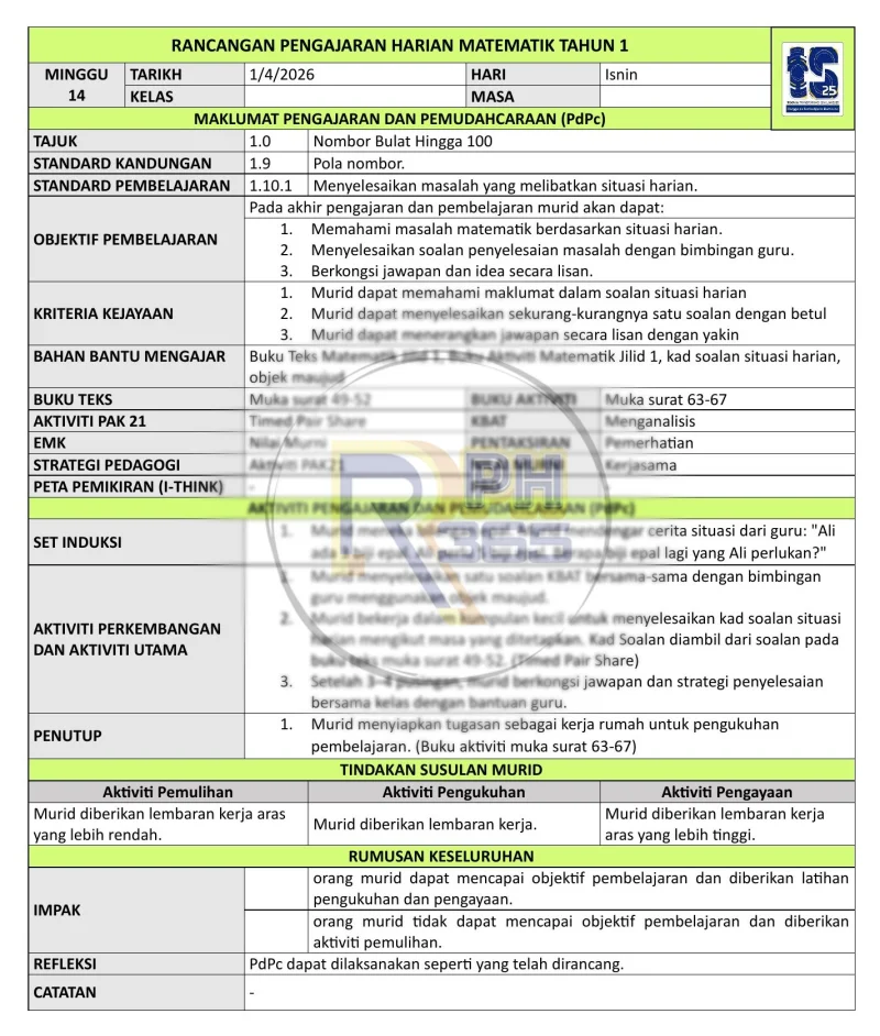 RPH & RPT 2026 Matematik Tahun 1 KSSR - 43 minggu lengkap meliputi Nombor & Operasi hingga 100 dengan PAK21. Format DOCX & PDF boleh edit.