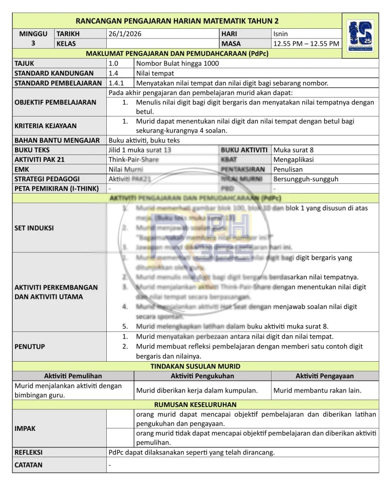 Kandungan merangkumi topik utama seperti Nombor Bulat Hingga 1000, nilai nombor, nilai tempat, rangkaian nombor, menganggar dan membundarkan nombor serta pola nombor. Setiap RPH dilengkapi dengan Standard Kandungan, Standard Pembelajaran dan aktiviti PAK21 yang berkesan.