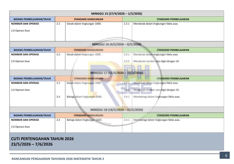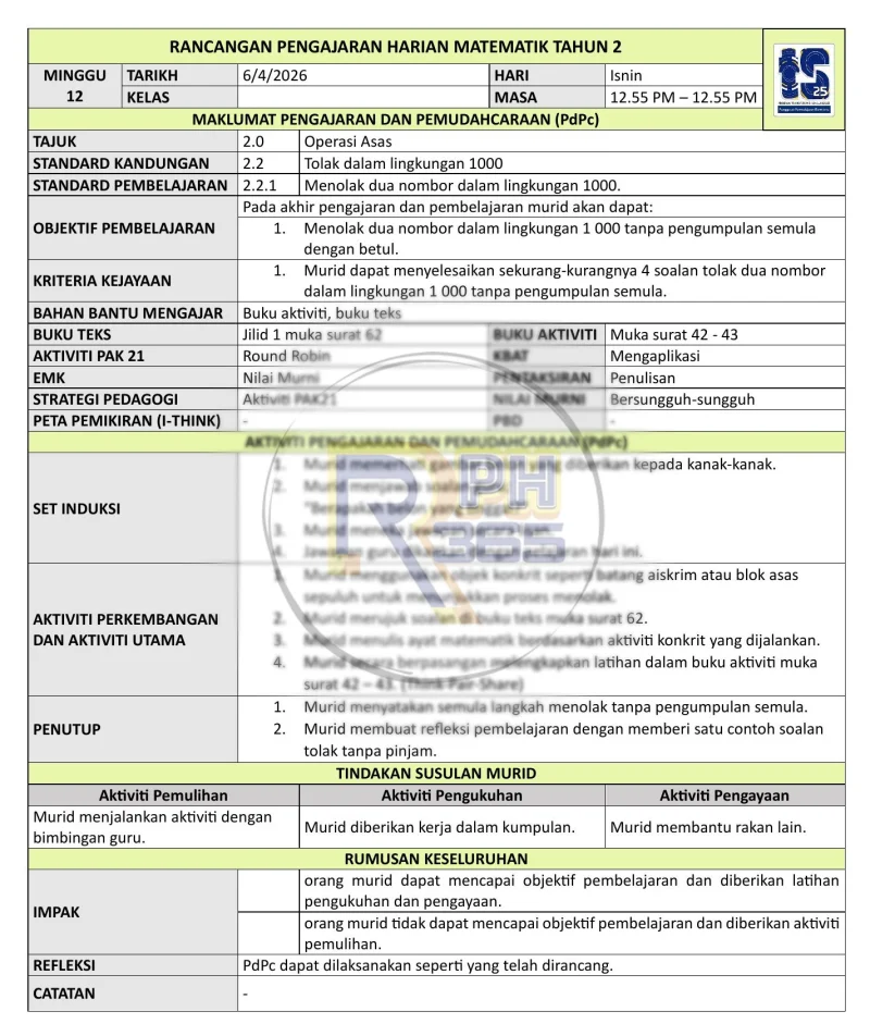 RPH & RPT 2026 Matematik Tahun 2 SK adalah set lengkap rancangan pengajaran yang disusun khas mengikut Takwim Persekolahan 2026 untuk 43 minggu pembelajaran. Ditulis oleh guru Matematik berpengalaman dan mengikuti DSKP KSSR Semakan 2017.