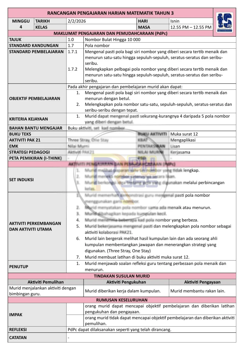 RPH & RPT 2026 Matematik Tahun 3 KSSR - 43 minggu lengkap bidang Nombor & Operasi hingga 10,000 dengan Standard Pembelajaran. Format DOCX boleh edit.