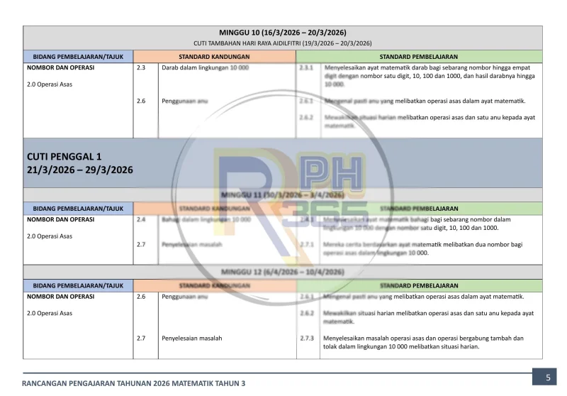 - Bidang pembelajaran Nombor dan Operasi - nombor bulat hingga 10,000, operasi tambah, tolak, darab