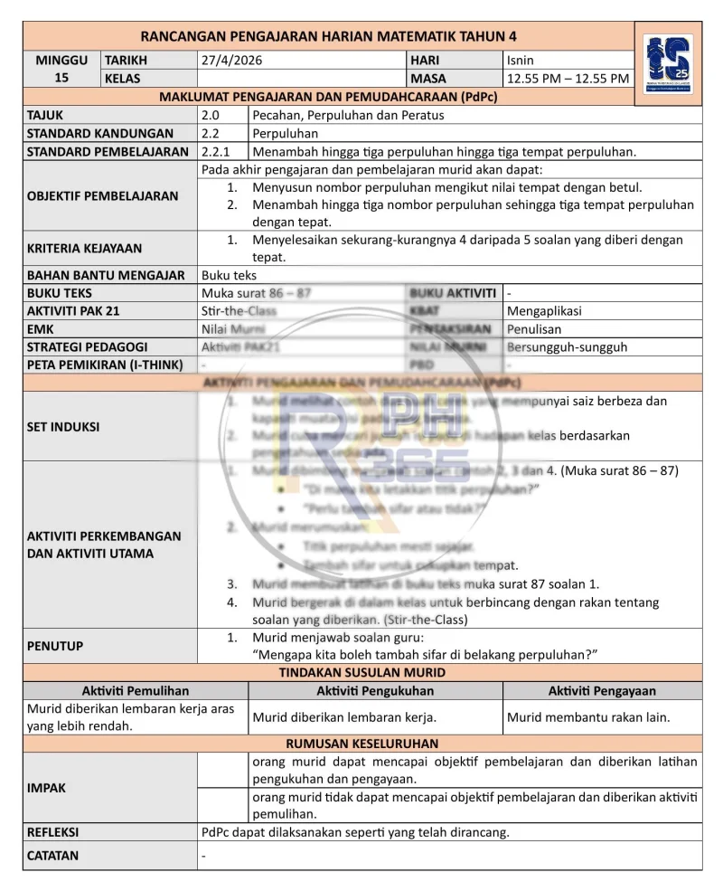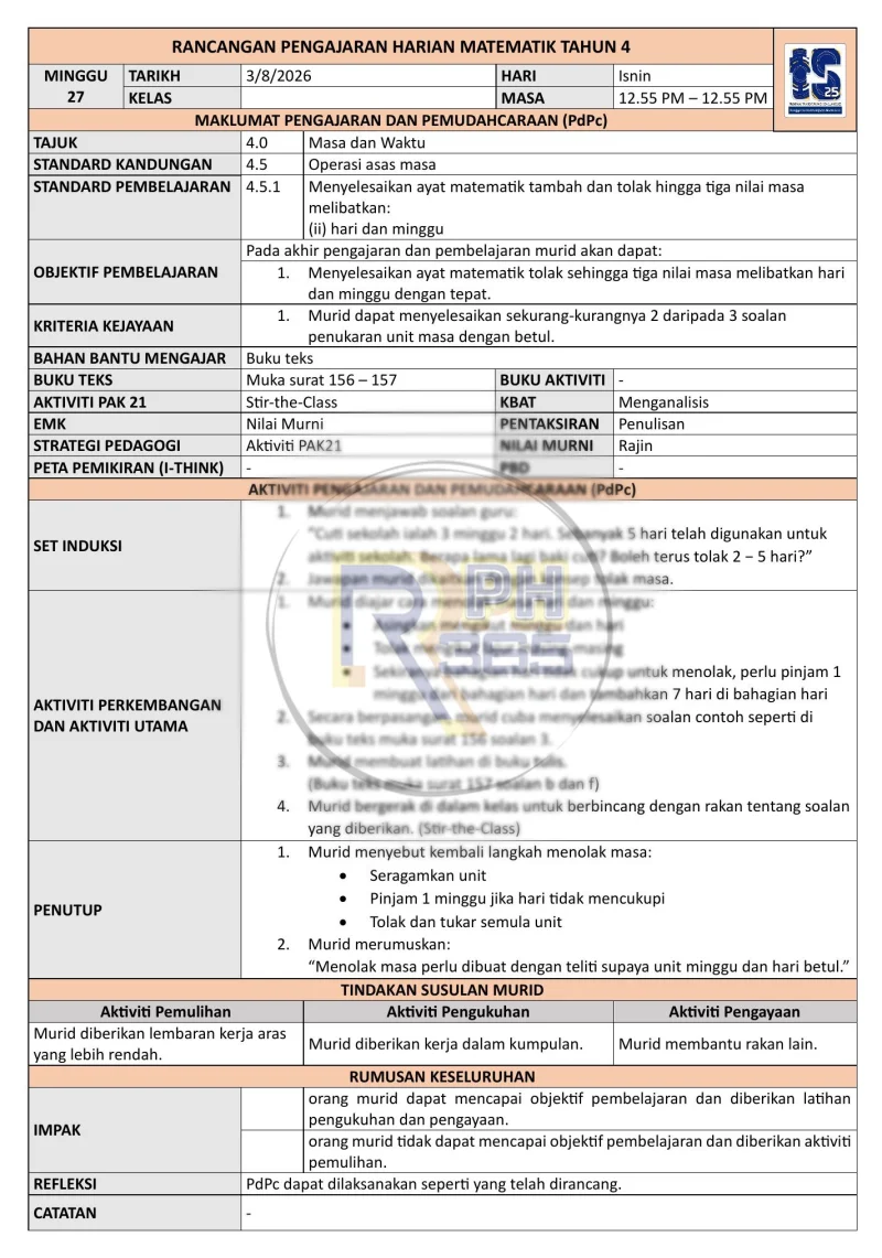 Sesuai untuk guru Matematik Tahun 4 yang mahukan perancangan pengajaran yang sistematik dan mudah disesuaikan. Fail dalam format Microsoft Word membolehkan penyuntingan penuh mengikut keperluan sekolah masing-masing.