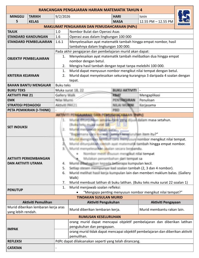 RPH & RPT 2026 Matematik Tahun 4 SK by RPH365 adalah set lengkap rancangan pengajaran yang disusun mengikut Takwim Persekolahan 2026 untuk 43 minggu pembelajaran. Ditulis oleh guru subjek berpengalaman dan berpandukan DSKP KSSR Semakan 2017 serta Buku Teks rasmi.
