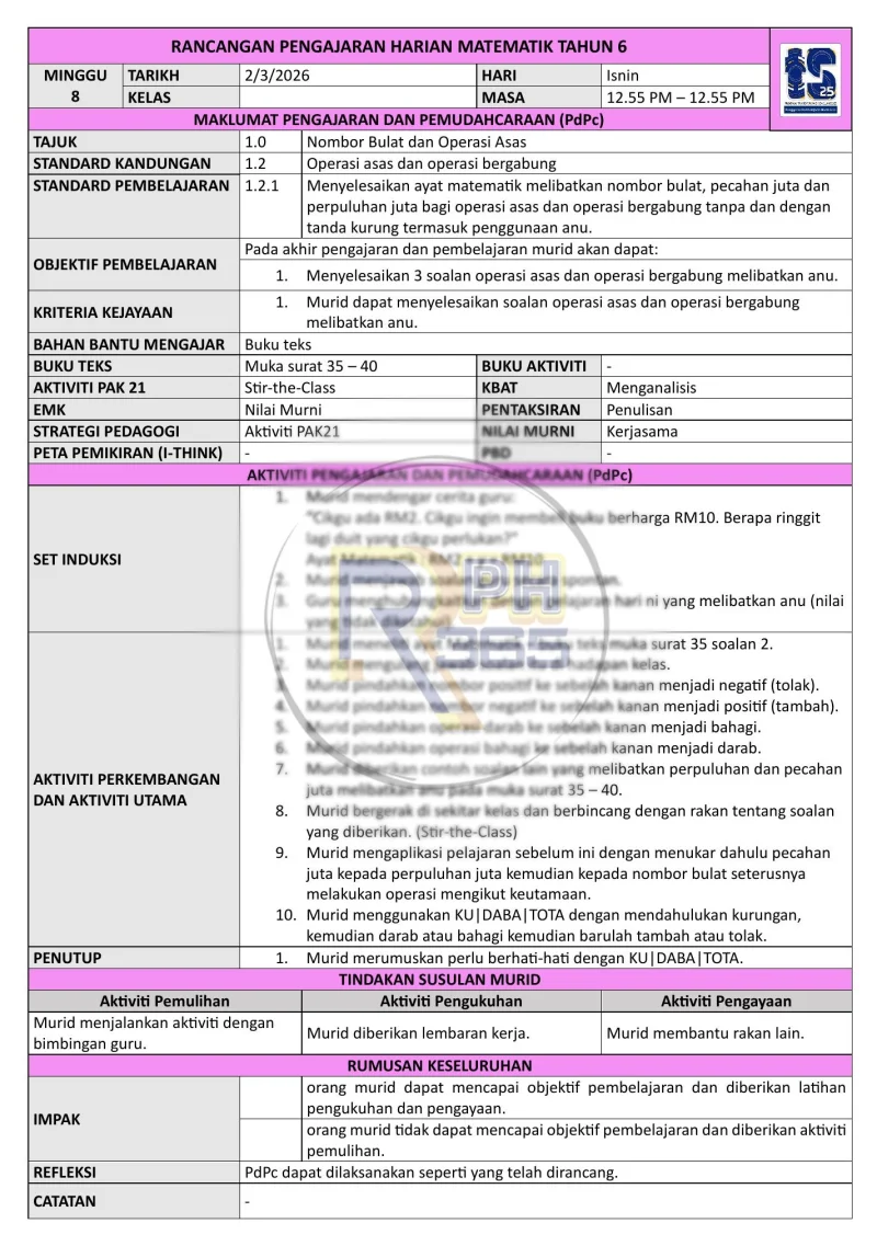 Kandungan merangkumi topik utama seperti Nombor Bulat dan Operasi Asas (nombor hingga 10 juta, operasi bergabung, nombor perdana), Pecahan, Perpuluhan dan Peratus dengan Standard Kandungan dan Standard Pembelajaran yang terperinci. Setiap RPH menggunakan pendekatan TS25 yang merangkumi PAK21, strategi pengajaran dan EMK.