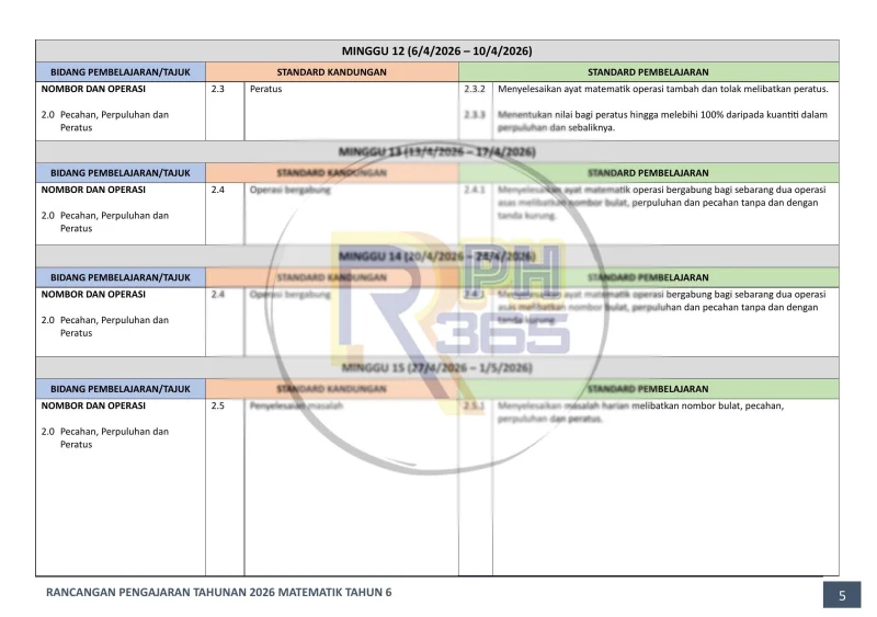 RPH & RPT 2026 Matematik Tahun 6 KSSR - komponen Nombor & Operasi, Pecahan, Perpuluhan & Peratus lengkap dengan Standard Kandungan & Pembelajaran. Format DOCX & PDF boleh edit.