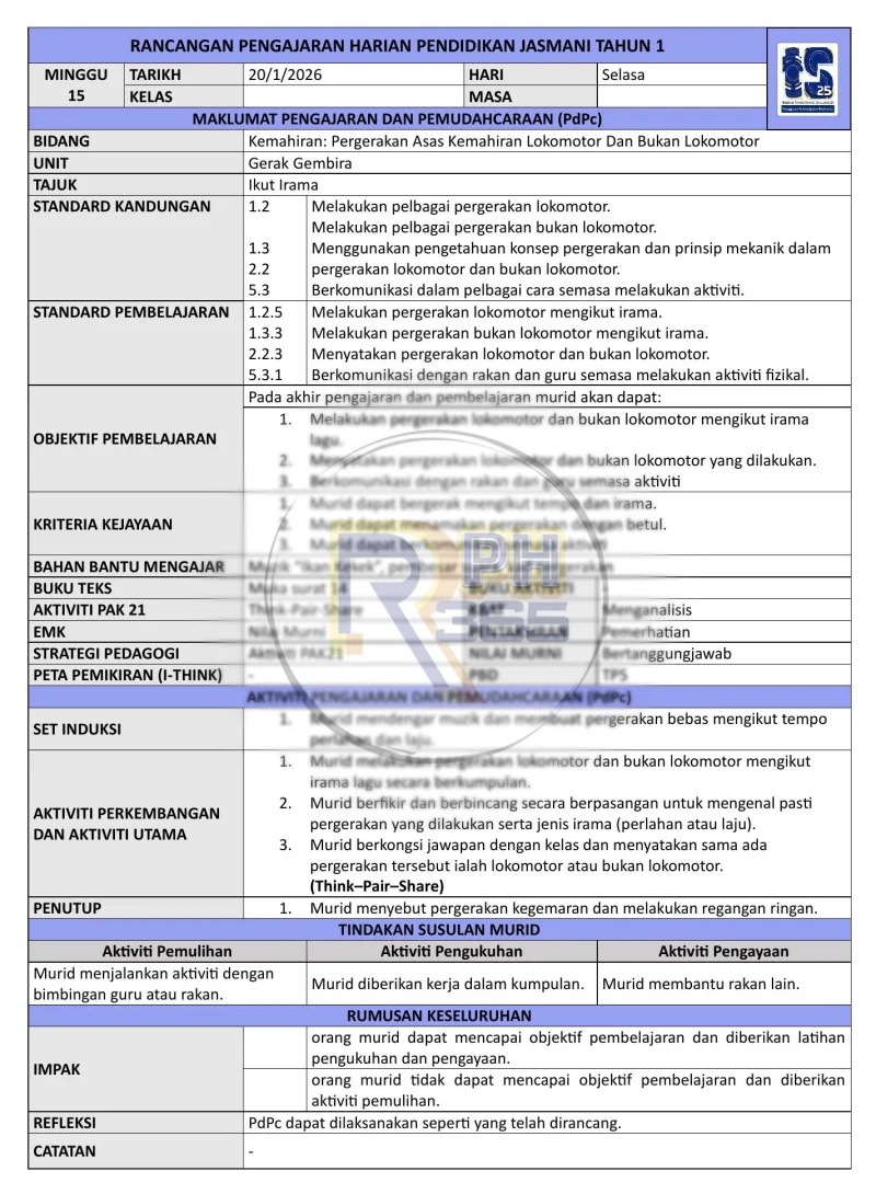RPH & RPT 2026 Pendidikan Jasmani Tahun 1 KSSR - 3 bidang kemahiran lengkap (Konsep Pergerakan, Kemahiran Lokomotor & Bukan Lokomotor). Format DOCX boleh edit.