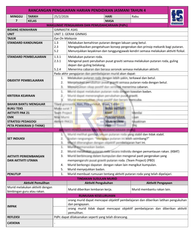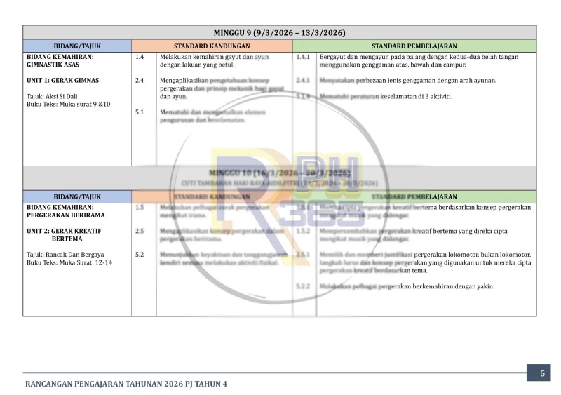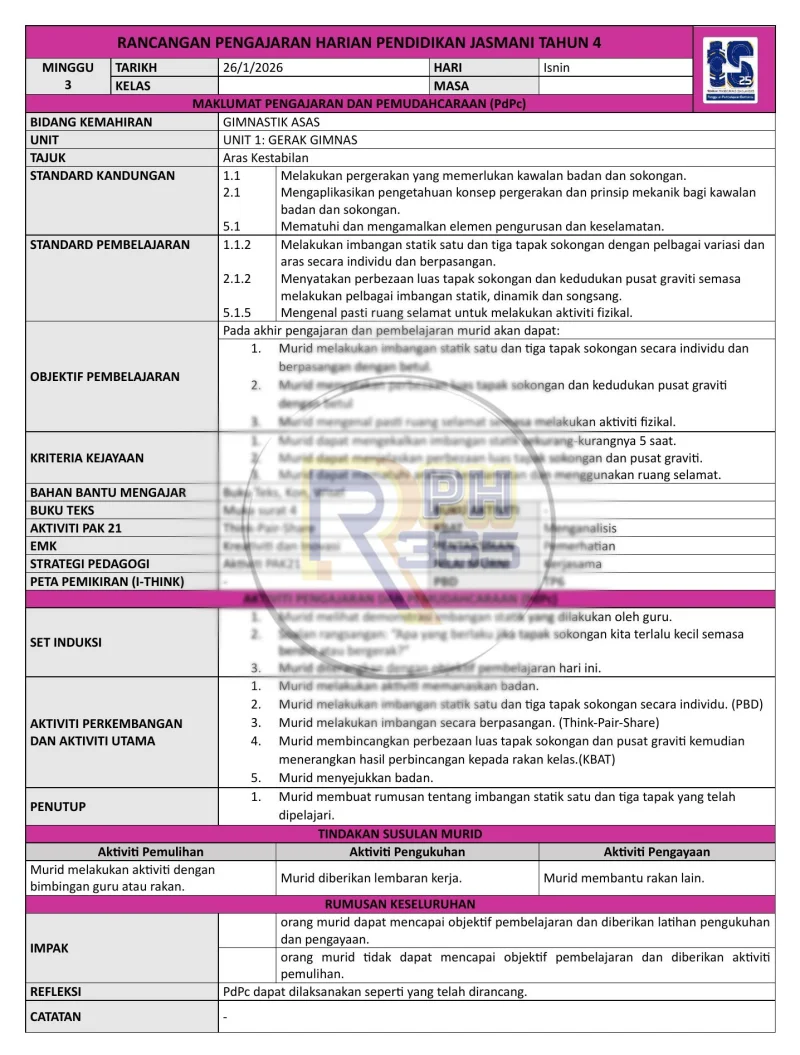 RPH & RPT 2026 Pendidikan Jasmani Tahun 4 KSSR - kemahiran gimnastik asas lengkap dengan unit Gerak Gimnas (imbangan, putaran, gayut). Format DOCX/PDF boleh edit.