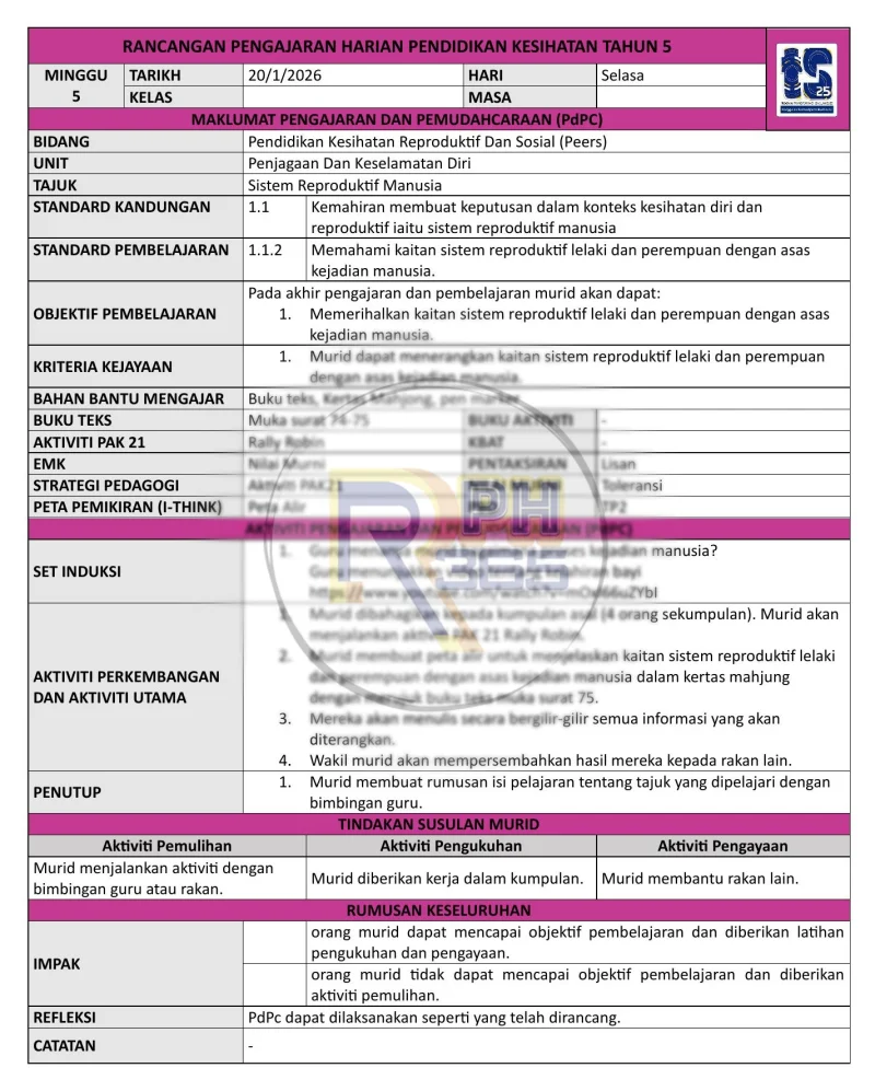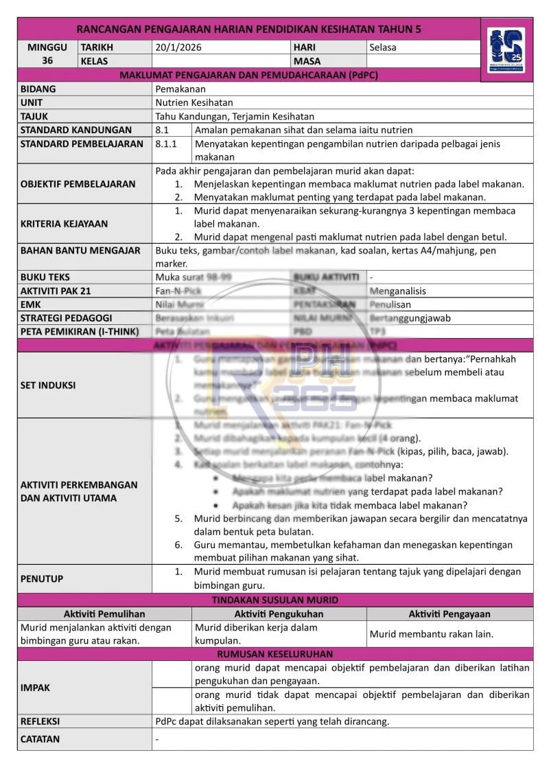 RPH 2026 Pendidikan Kesihatan SK Tahun 5 by RPH365