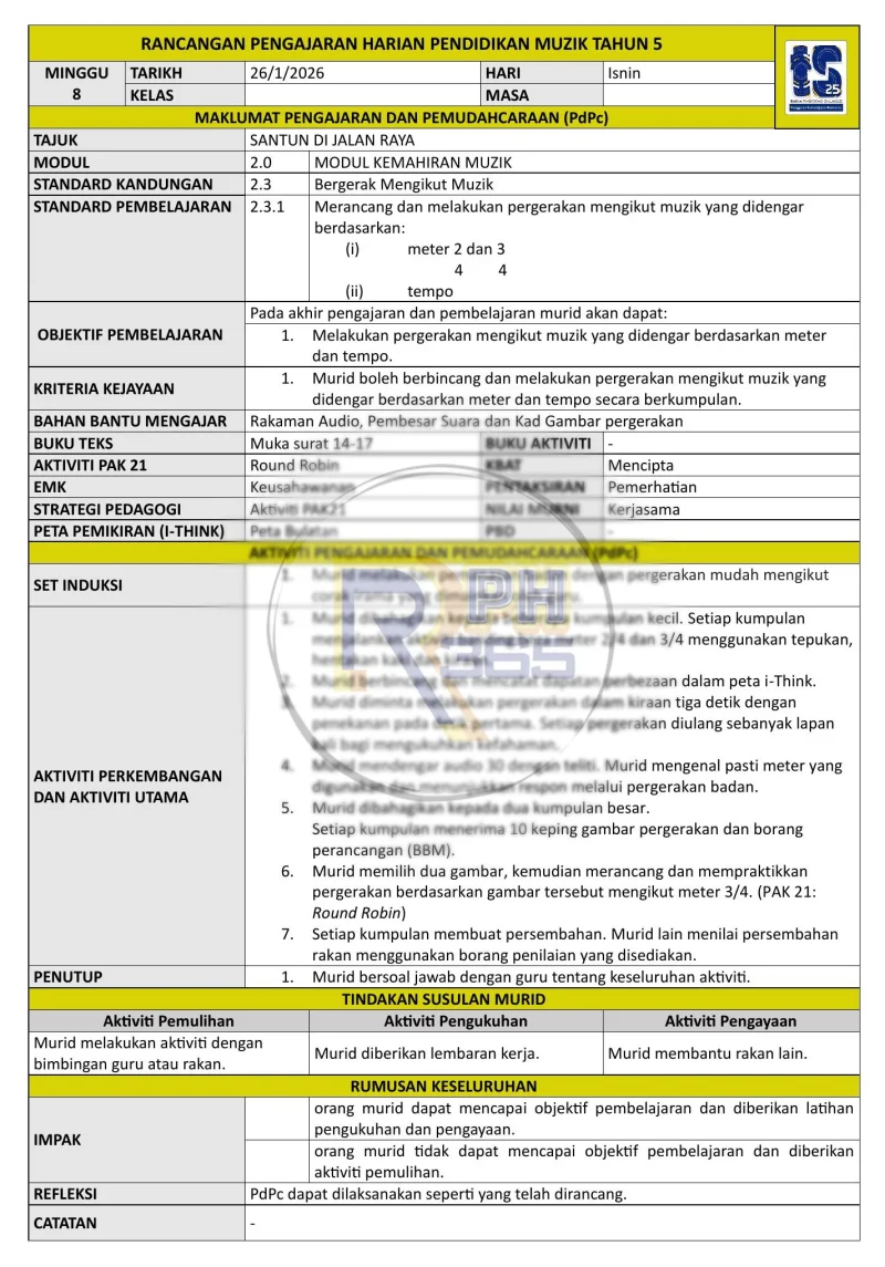 RPH & RPT 2026 Pendidikan Muzik Tahun 5 KSSR - 3 unit lengkap (Waspada Selalu, Santun di Jalan Raya, Busak Pakui) dengan modul nyanyian, perkusi, rekoder not E-D' dan kreativiti melodi. Format DOCX boleh edit.