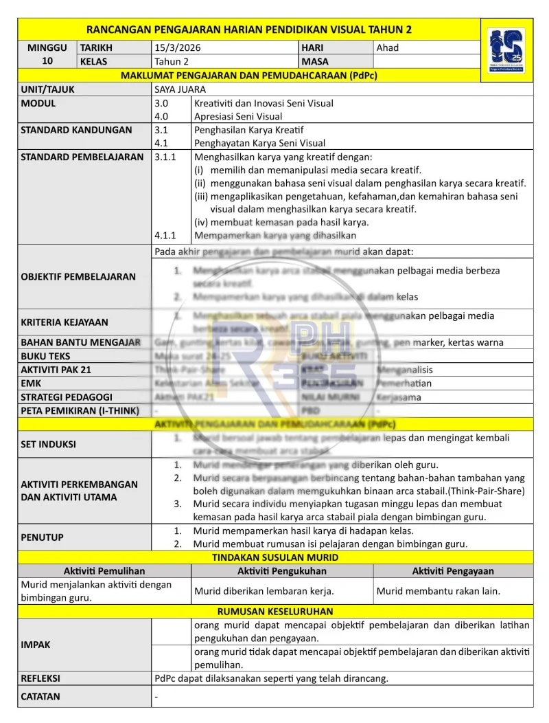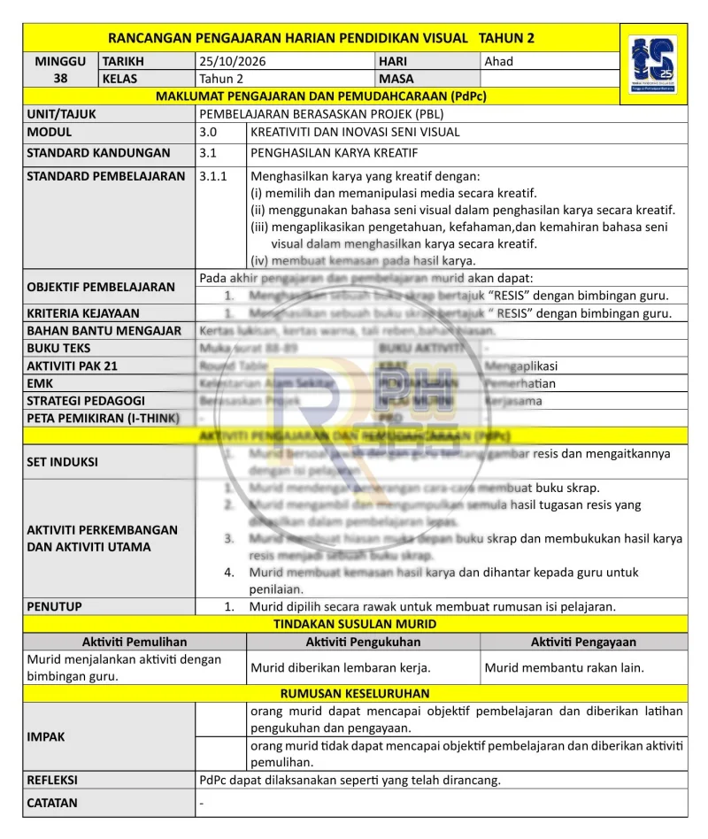 Kandungan lengkap termasuk RPT dan RPH untuk 43 minggu Takwim Persekolahan 2026, ditulis oleh guru subjek berpengalaman dengan pendekatan PAK21 dan strategi EMK. Setiap unit merangkumi 4 bidang utama: Bahasa Seni Visual, Kemahiran Seni Visual, Kreativiti & Inovasi, dan Apresiasi Seni Visual.