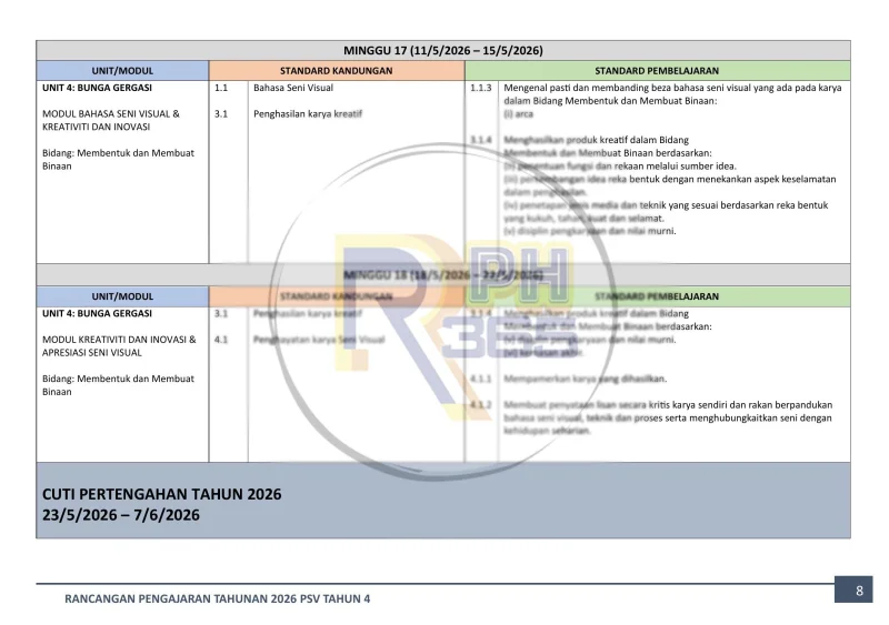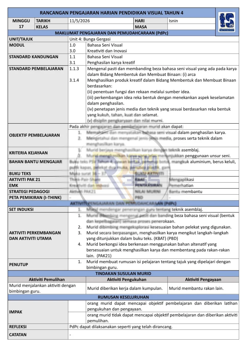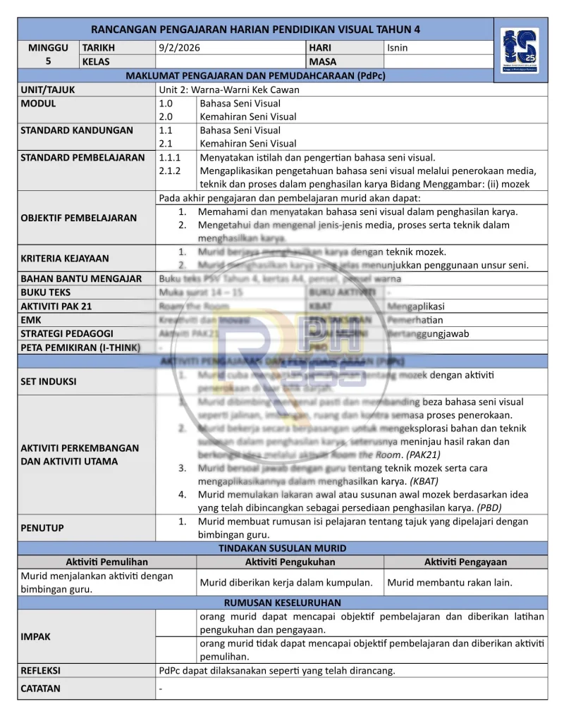 RPH & RPT 2026 Pendidikan Seni Visual Tahun 4 SK disusun lengkap mengikut Takwim Persekolahan 2026 (43 minggu) dan berpandukan DSKP KSSR Semakan 2017. Ditulis oleh guru subjek berpengalaman untuk membantu guru melaksanakan PBD dengan berkesan.