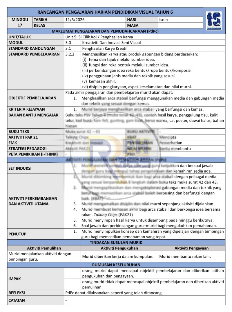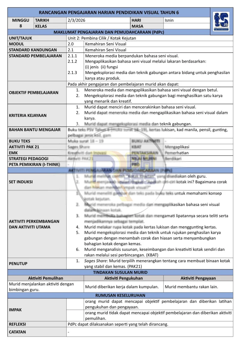 Ditulis oleh guru subjek berpengalaman, RPH ini dilengkapi dengan Standard Kandungan dan Standard Pembelajaran yang terperinci, strategi PAK21, dan boleh disesuaikan mengikut keperluan sekolah. Sesuai untuk guru Pendidikan Seni Visual yang ingin menjalankan pengajaran berkualiti dan terancang.