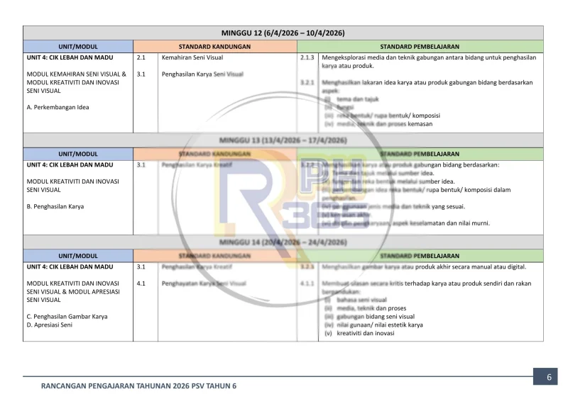 RPH & RPT 2026 Pendidikan Seni Visual Tahun 6 KSSR - 4 unit lengkap (Gambaran Minda, Pembina Cilik, Ilusi & Realiti, Cik Lebah & Madu) dengan modul bahasa seni, kemahiran seni dan kreativiti. Format DOCX boleh edit.