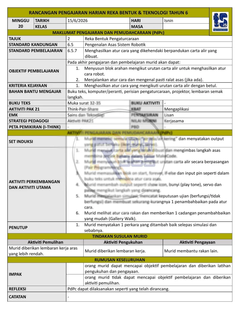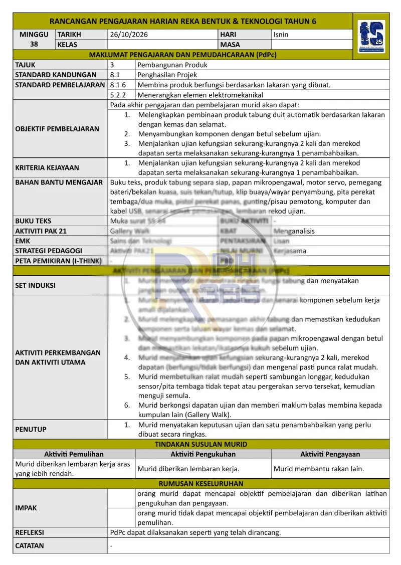 RPH & RPT 2026 Reka Bentuk dan Teknologi Tahun 6 KSSR - topik Reka Bentuk Produk Elektromekanikal & Sistem Robotik lengkap 43 minggu. Format DOCX boleh edit.