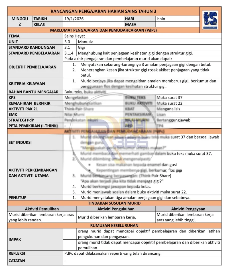 RPH & RPT 2026 Sains Tahun 3 SK by RPH365 merupakan set lengkap rancangan pengajaran yang disediakan khas untuk guru Sains Tahun 3 mengikut kurikulum KSSR Semakan 2017. Produk ini mengandungi RPT dan RPH untuk 43 minggu takwim persekolahan 2026.