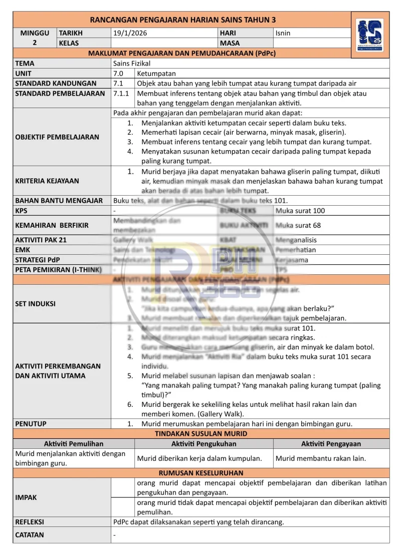 Sesuai untuk guru Sains sekolah rendah yang ingin menjimatkan masa dalam penyediaan rancangan pengajaran yang berkualiti. Format DOCX membolehkan editing penuh mengikut keperluan sekolah masing-masing.