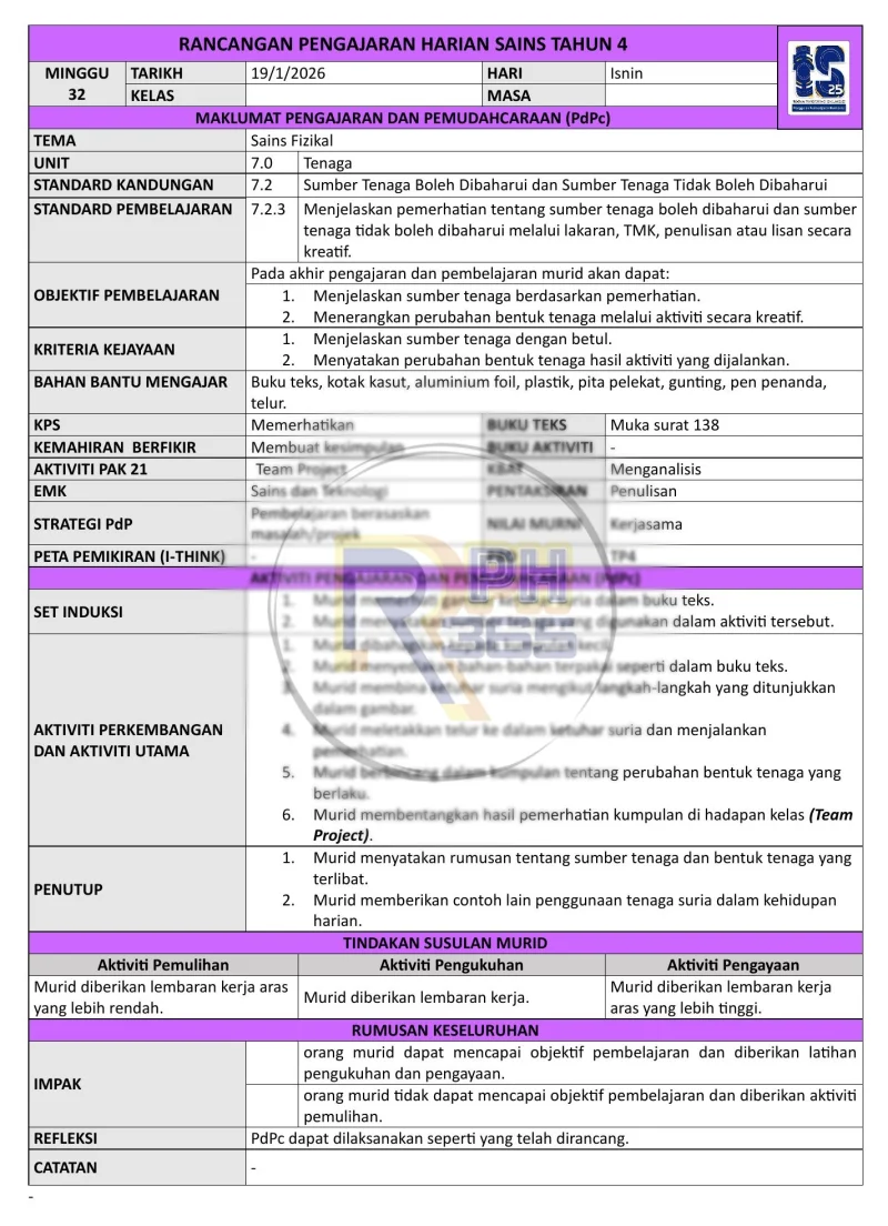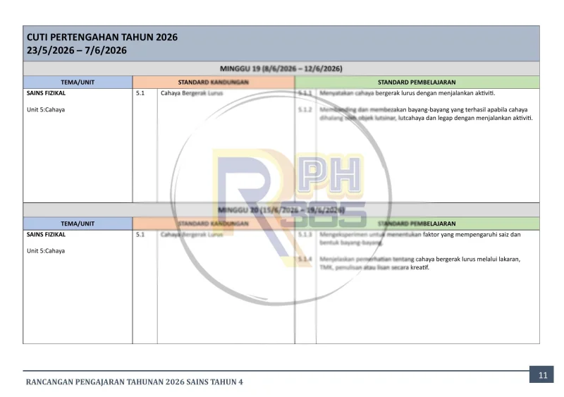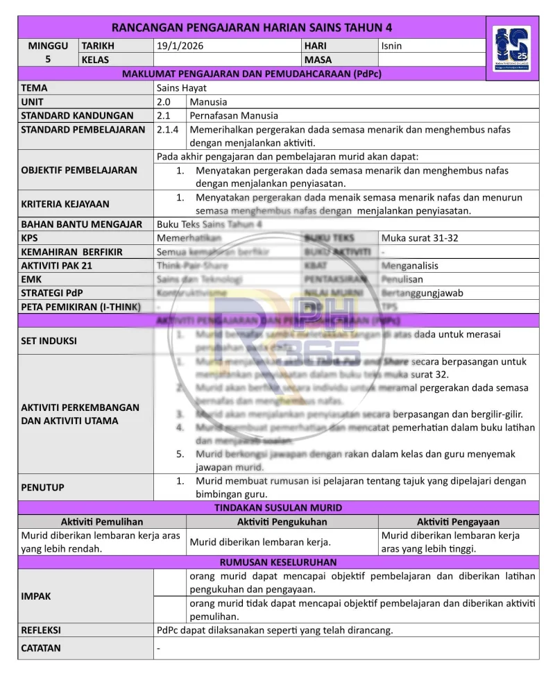 RPH & RPT 2026 Sains Tahun 4 SK by RPH365 ialah set lengkap rancangan pengajaran yang disediakan khas untuk guru Sains Tahun 4 mengikut kurikulum KSSR Semakan 2017. Pakej ini mengandungi RPT dan RPH untuk 43 minggu pembelajaran sepanjang tahun 2026.
