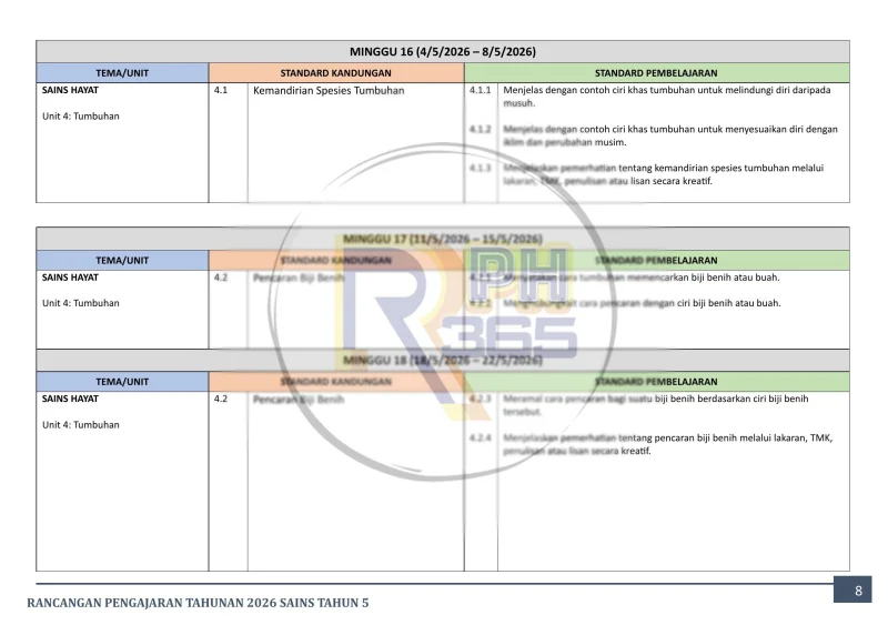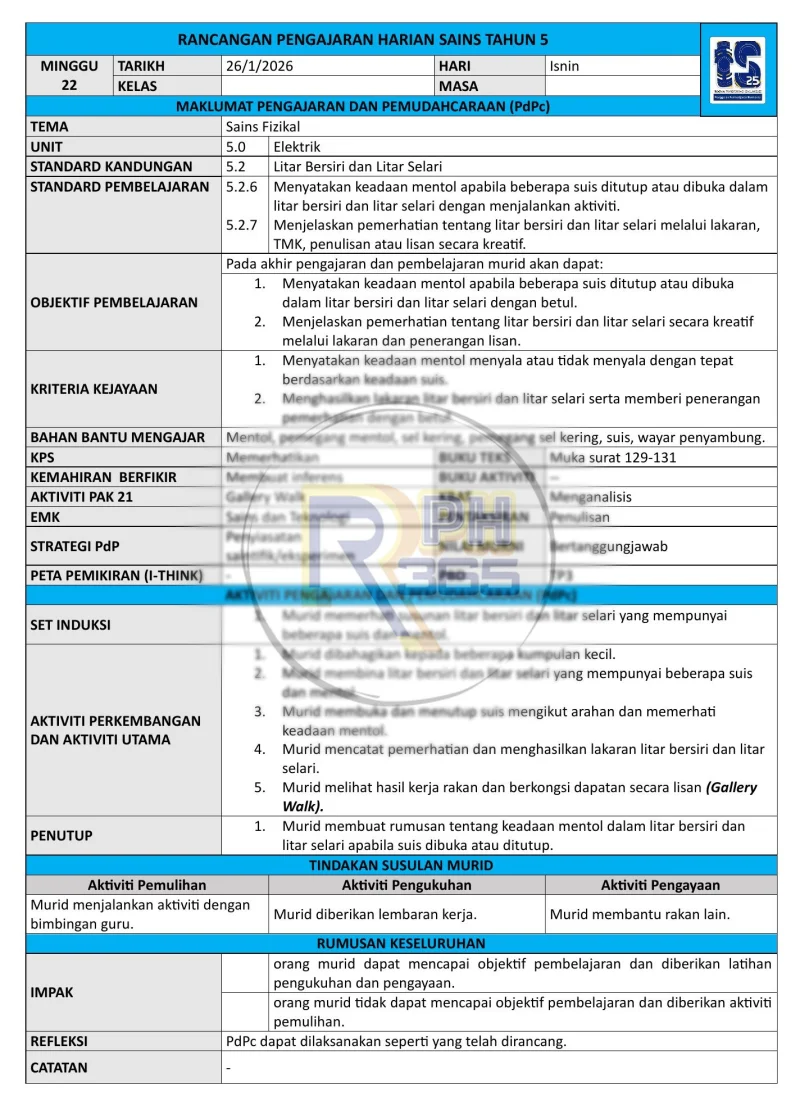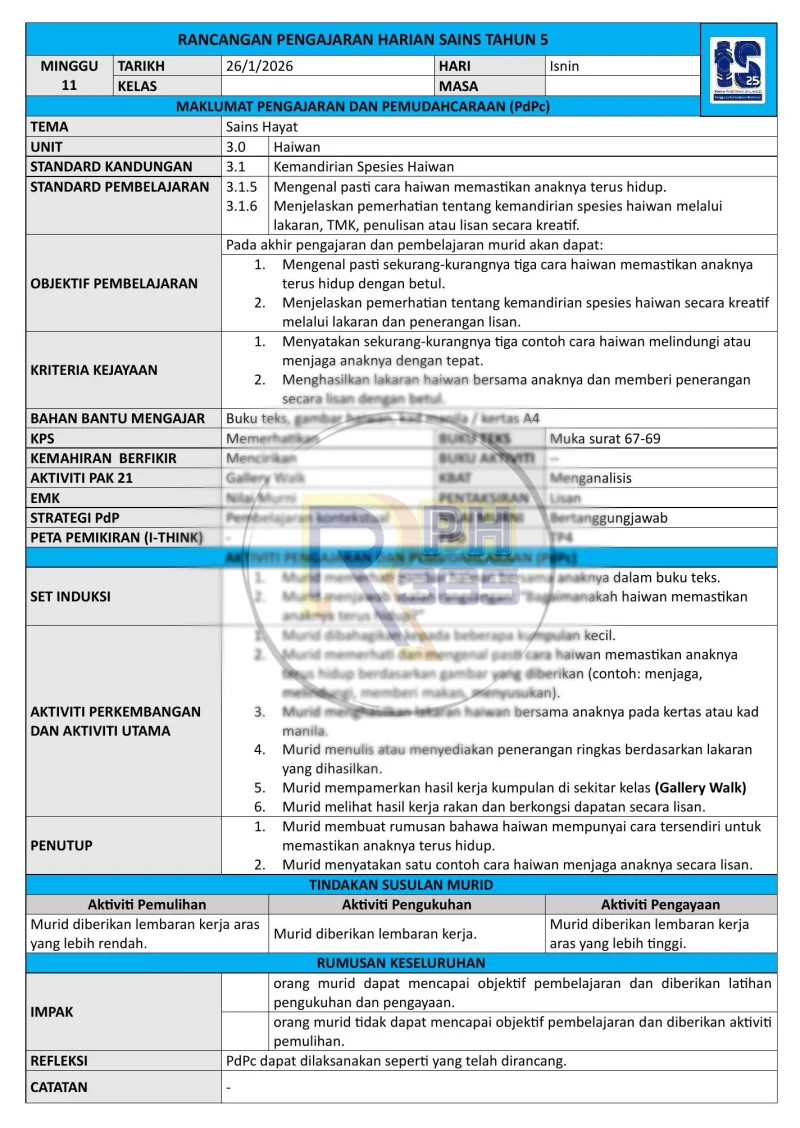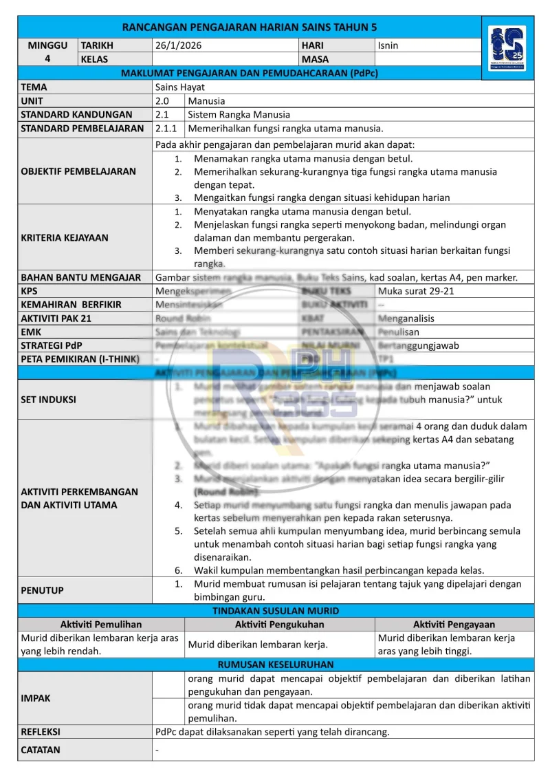 RPH & RPT 2026 Sains Tahun 5 SK by RPH365 adalah koleksi lengkap rancangan pengajaran harian dan rancangan pengajaran tahunan yang disediakan khusus untuk Sains Tahun 5 KSSR. Set ini merangkumi 3 unit utama iaitu Kemahiran Saintifik, Sistem dalam Manusia (rangka, peredaran darah, perkaitan sistem), dan Kemandirian Haiwan.