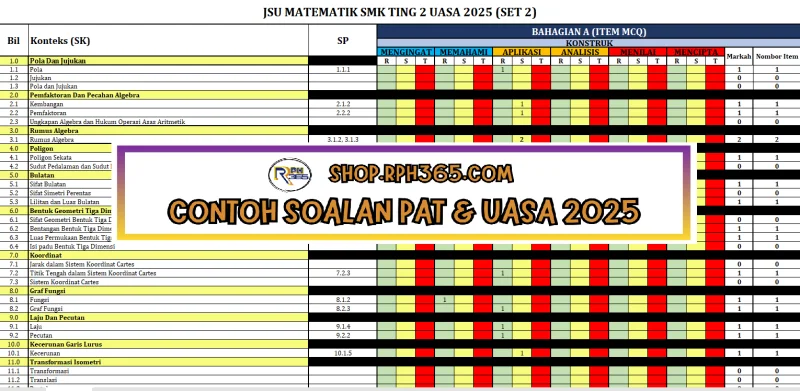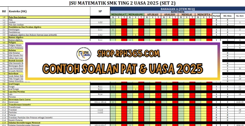 Pakej ini mengandungi 2 set soalan yang komprehensif, lengkap dengan skema jawapan dan Jadual Spesifikasi Ujian (JSU) untuk memudahkan guru merancang pengajaran dan penilaian. Soalan-soalan ini merangkumi semua topik penting Matematik Tingkatan 2 KSSM termasuk algebra, geometri, statistik dan probabiliti.