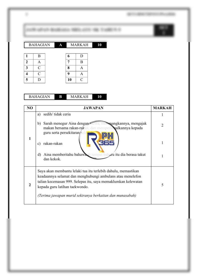 - Bahagian B: Soalan 1 – subjektif (5 markah); Soalan 2 – subjektif (5 markah)